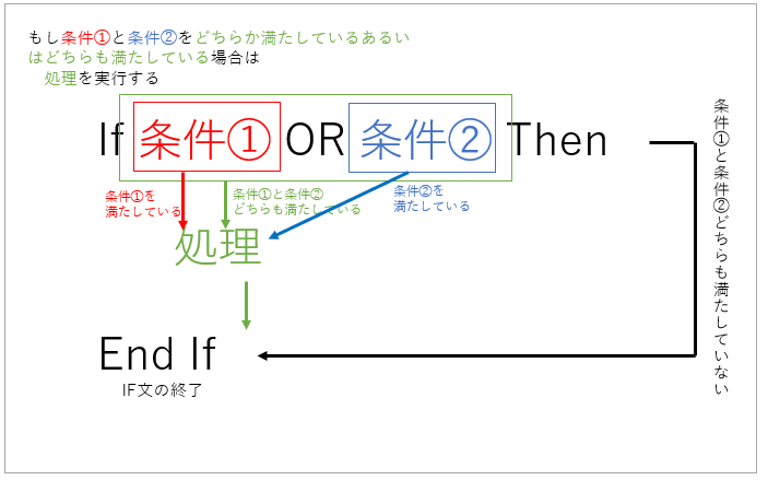 「OR」でどちらかが条件を満たす場合、またはどちらも満たす場合に処理を実行することができます。