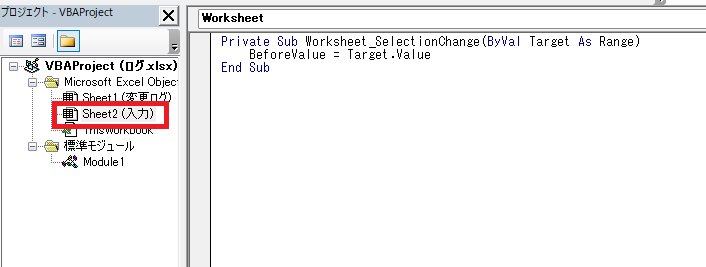 今回は「入力」シートのシートモジュールにコードを貼ってください。