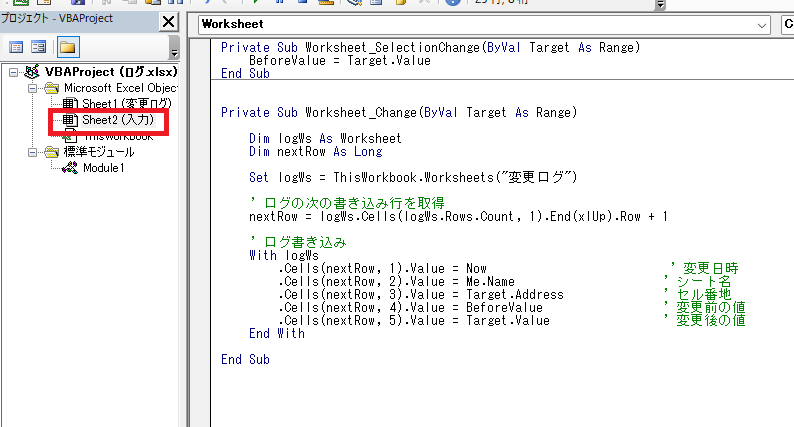 Set logWs = ThisWorkbook.Worksheets("変更ログ")