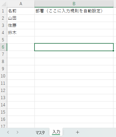 - 「入力」シートに、入力したい列(例:B列「部署」)を用意する