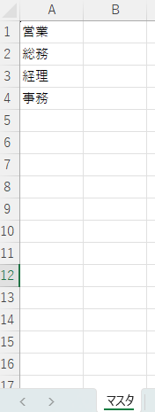 リストに入れたい項目をA列に入力してください。そしてシート名を「マスタ」に変更してください。