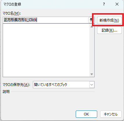 OnAction = "正方形長方形1_Click" の文字列は、実際のマクロ名と完全一致している必要があります。