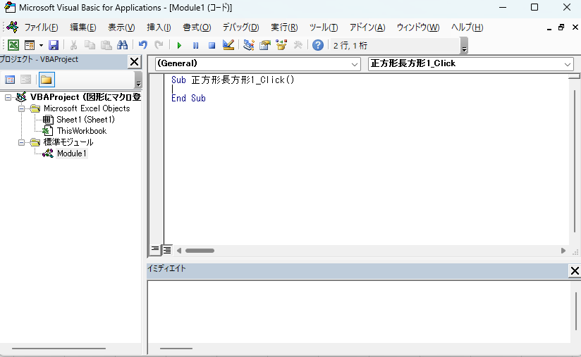 このコードを実行すると、Rectangle 1 という図形をクリックしたときに 「方形長方形1_Click」 マクロが実行されるようになります。